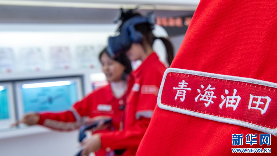 在青海油田采油一厂尕斯运维中心的采油井前,采油工黄群(右)和同事进行设备巡检。