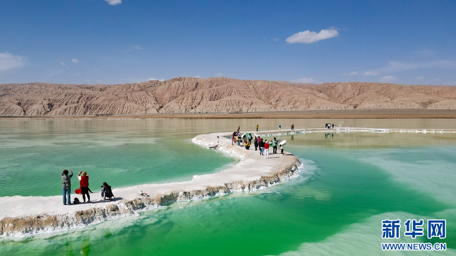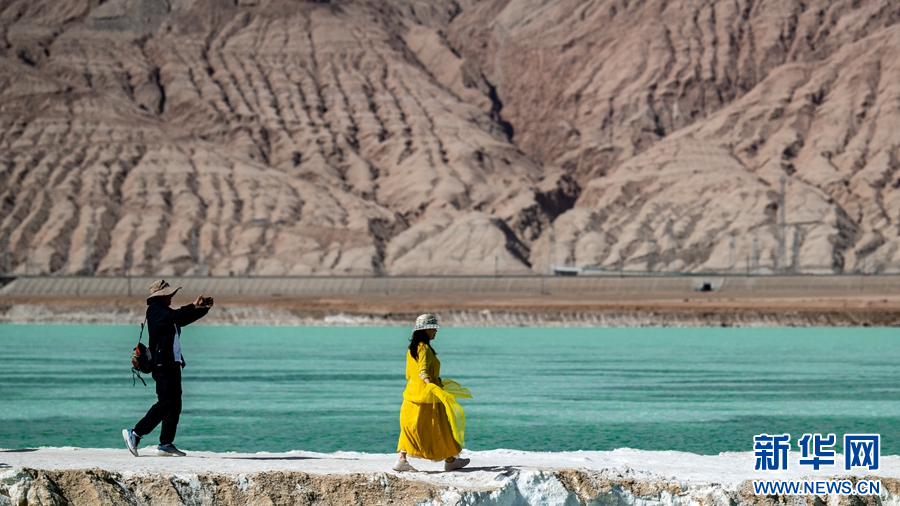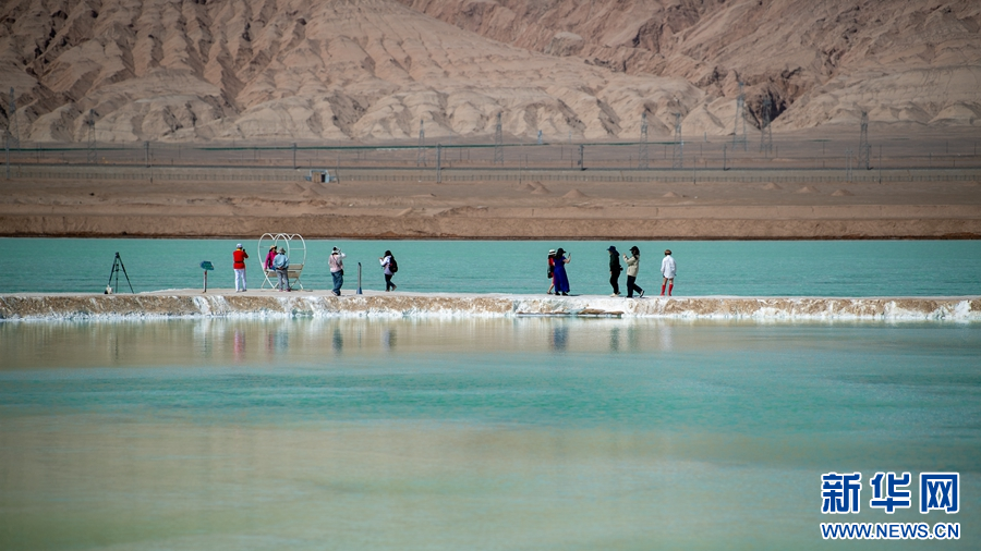 5月19日,专列游客在茫崖市翡翠湖景区游玩。