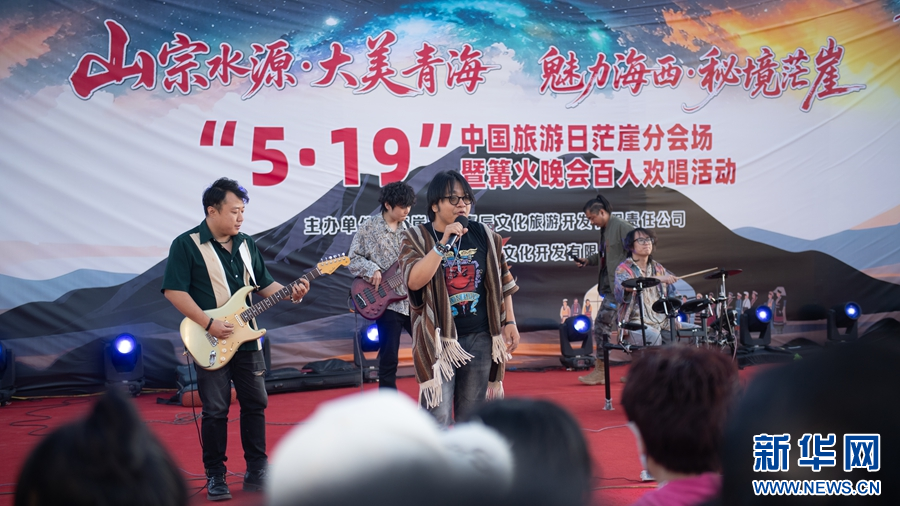图为茫崖市为专列游客准备的篝火晚会百人欢唱活动现场。(5月19日摄)