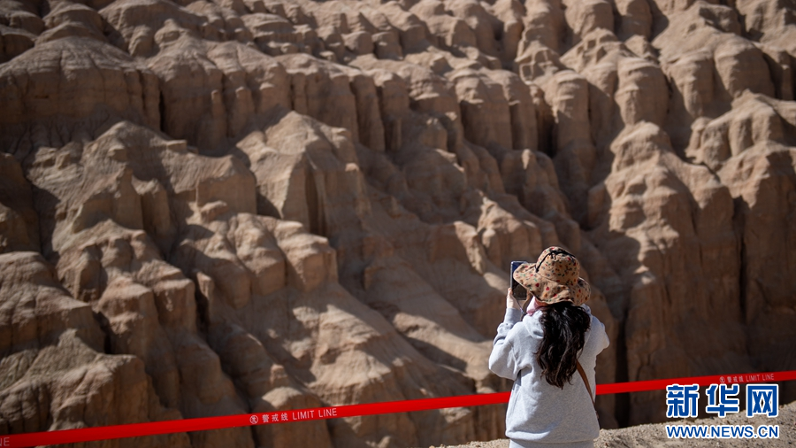 5月19日,一名专列游客在茫崖市千佛崖景区拍照留念。