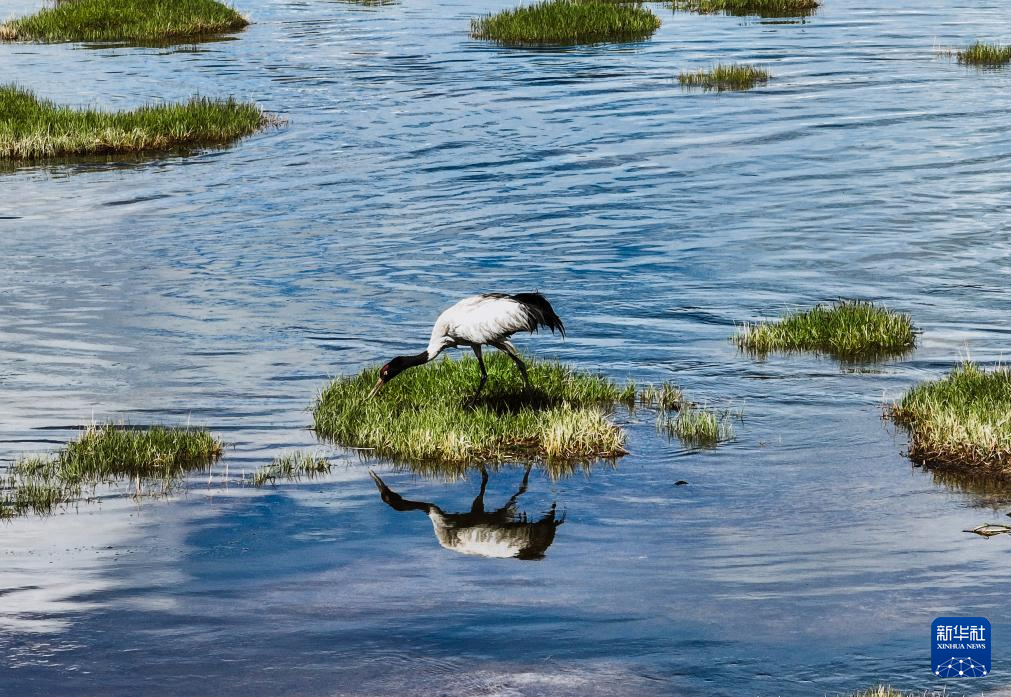这是6月4日在青海隆宝国家级自然保护区拍摄的黑颈鹤(无人机照片)。新华社发(杜笑微摄)