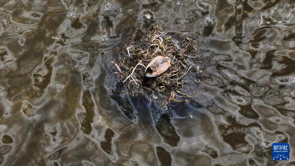 这是6月4日在青海隆宝国家级自然保护区拍摄的筑巢的凤头䴙䴘(无人机照片)。新华社发(杜笑微摄)