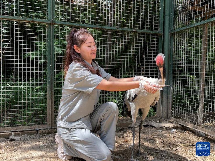 7月3日,西宁野生动物园饲养员李晓清在给黑颈鹤喂食。新华社记者 周盛盛 摄